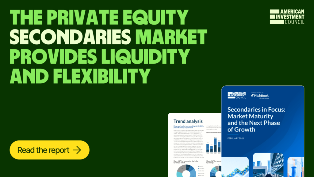 WASHINGTON, D.C. — The American Investment Council today released a new report examining the growth of the private equity secondaries market in the U.S. The report, using data provided by PitchBook, finds the secondaries market plays an increasingly important role in providing liquidity and portfolio flexibility, while continuing to deliver strong investment performance.