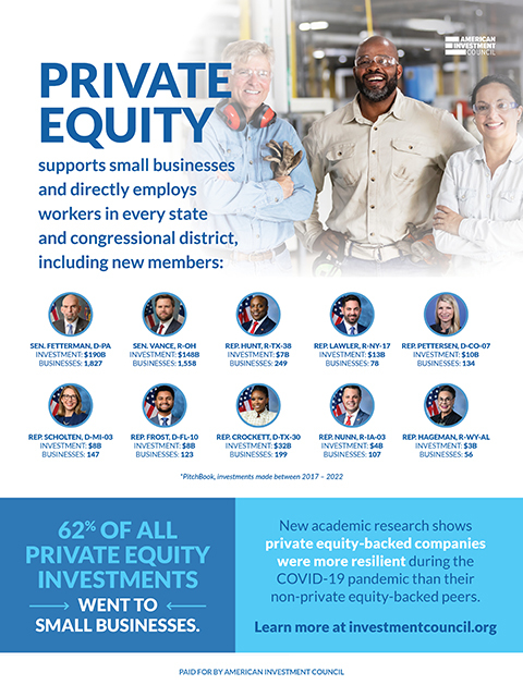 Washington, D.C. – Today, the American Investment Council (AIC) released a new print ad in POLITICO highlighting how the private equity industry supports jobs and invests billions of dollars in the communities of all new members of Congress.